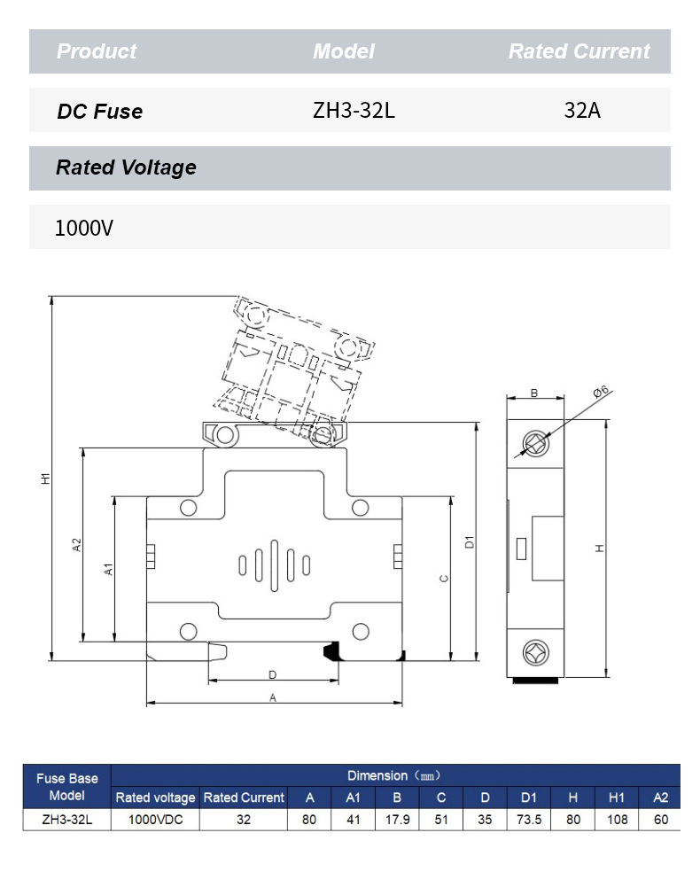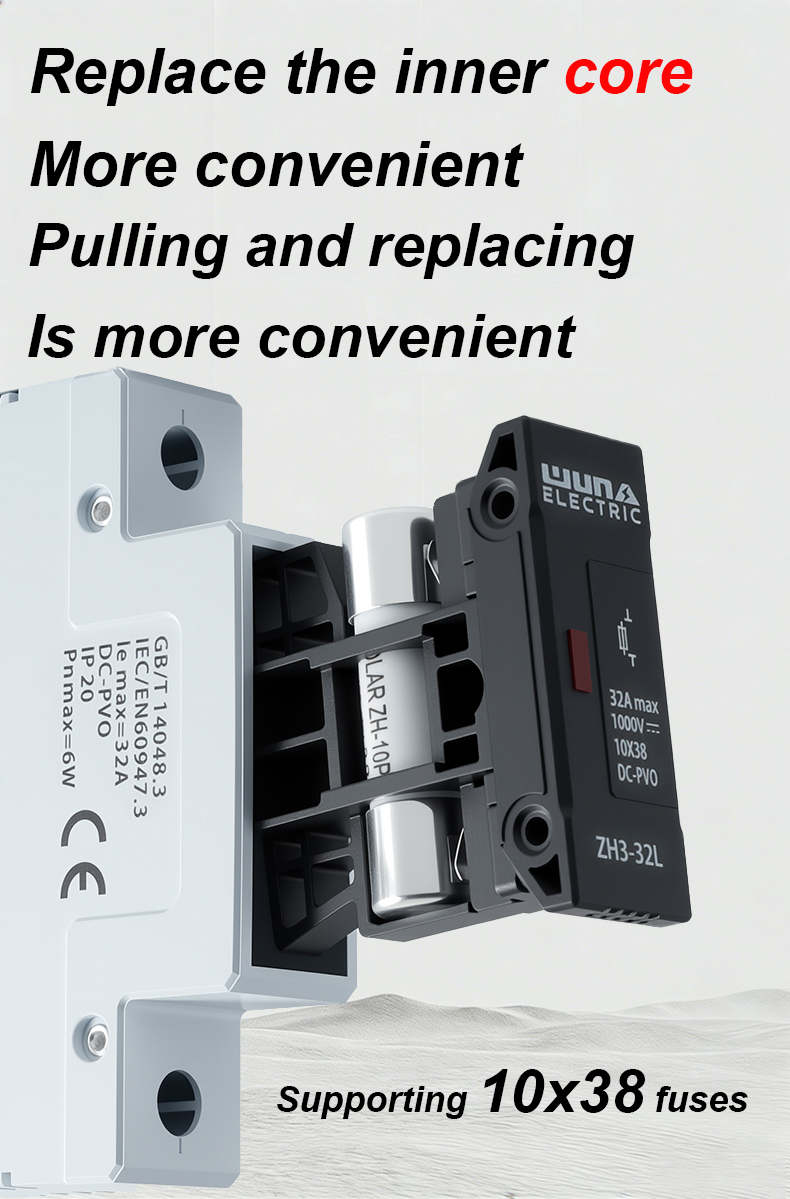 ZH32L DC 1000V kaitsmehoidik on suure jõudlusega komponent, mis on loodud tagama usaldusväärse kaitse elektriahelatele fotogalvaanilistes ja muudes alalisvoolurakendustes. Tugeva konstruktsiooniga ja suurepärase isolatsiooniga ZH32L DC 1000 V kaitsmehoidik sobib kuni 1000 V alalisvooluga kaitsmete ohutuks paigutamiseks, vältides tõhusalt ülevoolu ja lühisekahjustusi.